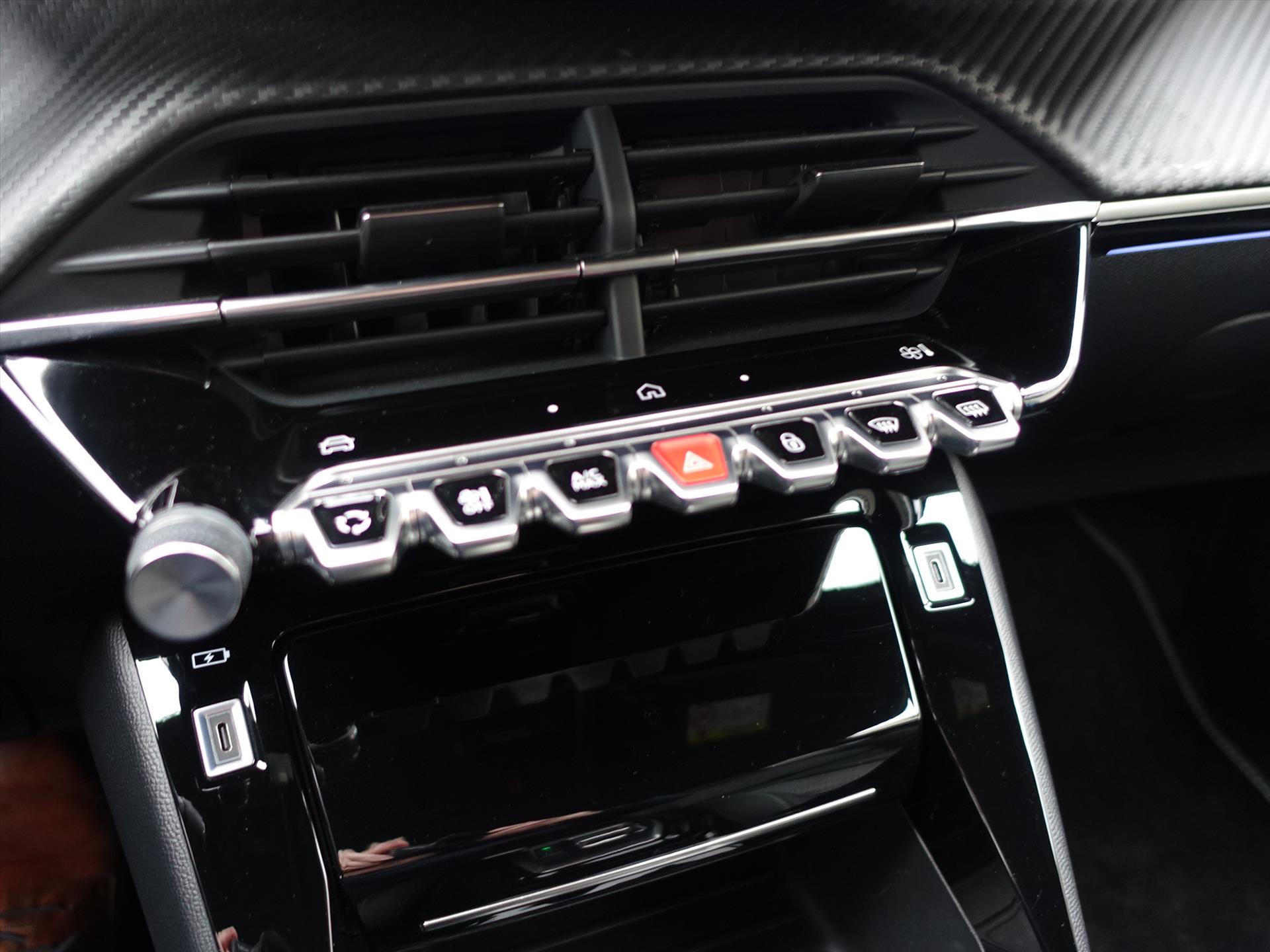 Dashboard in zacht materiaal met carboneffect en hoogglans zwarte sierstrip met chromen bies